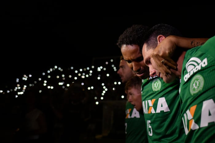 "Siento indignación", dijo. Facebook Twitter Pinterest Los jugadores que no viajaron en el vuelo fatal rindieron homenaje a sus compañeros de equipo en el estadio del club en Chapecó.Fotografía: Douglas Magno / AFP / Getty Images